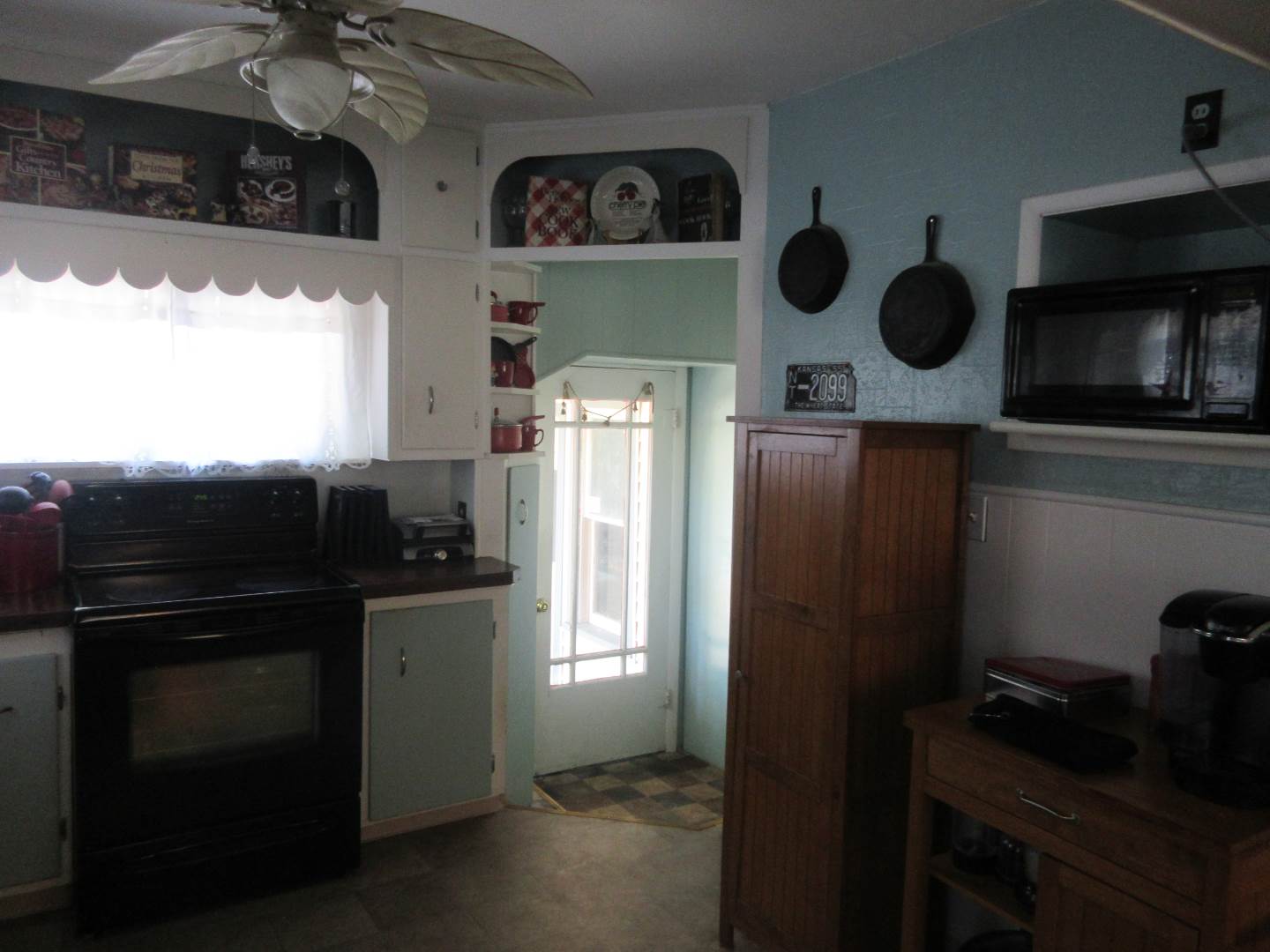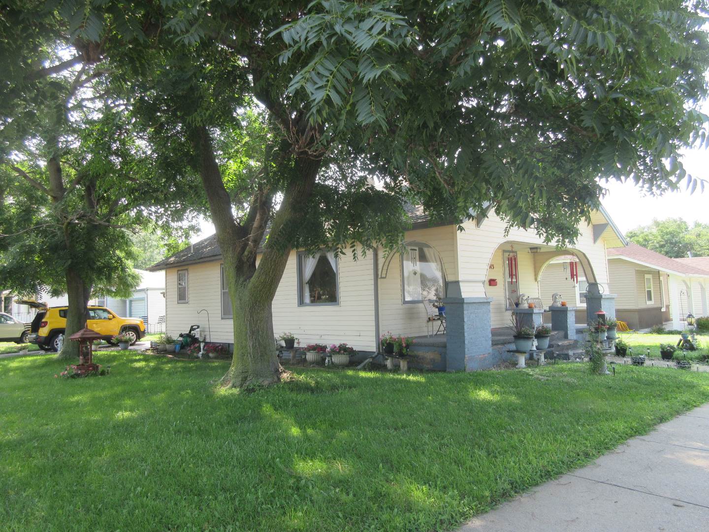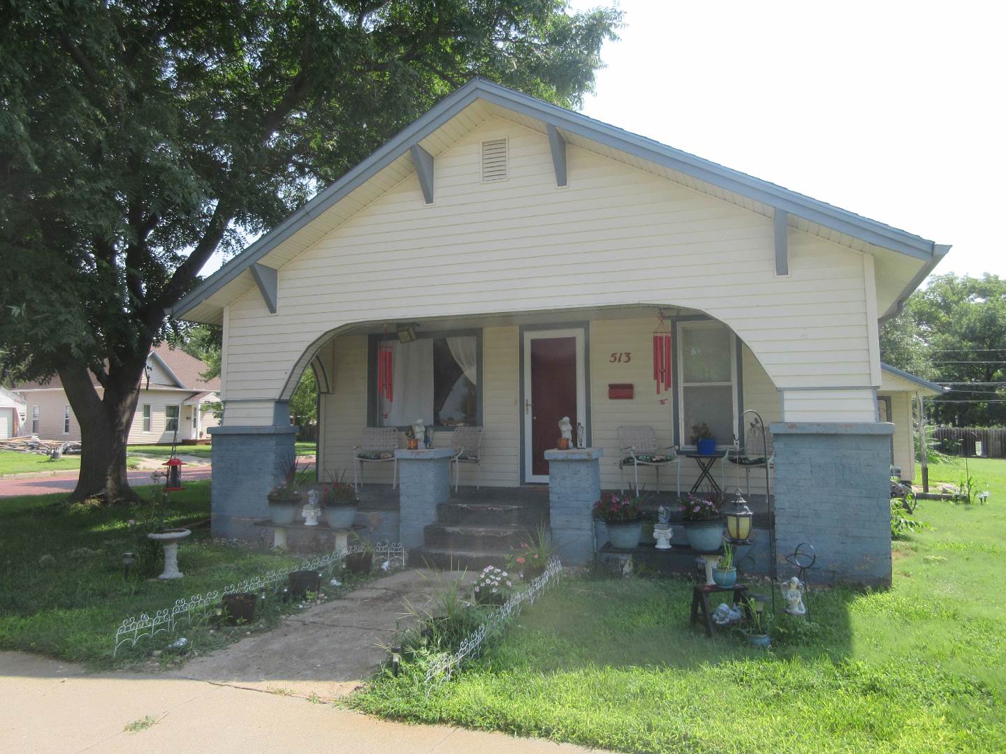 513 N. Jones, Norton, Ks. 2 bedrooms and 2 bathrooms bungalow with finished basement and 1 car attached garage. Large open front porch with mature landscaping on a corner lot. Open concept living space with living, dining and kitchen. Kitchen and dining area with built in shelves and bookcases to create that bungalow feel. Refrigerator & range stay with home. 2 bedrooms upstairs with built in closets and shelves. Full bathroom between the bedrooms with a soaker tub-shower combination. Linen closet in hallway. The basement has 4 large spaces that one could be a non-conforming bedroom. There is a bathroom with a shower and linen closet. Built in bookcases in 2 of the other rooms. One room is currently set up to be a media room. A laundry room at the base of the stairs is roomy and has a large utility closet. The garage is attached to house with an exterior door that opens into a shop/storage area with a 1 car space. There is also, another exterior door to the shop part from the South side of the home.