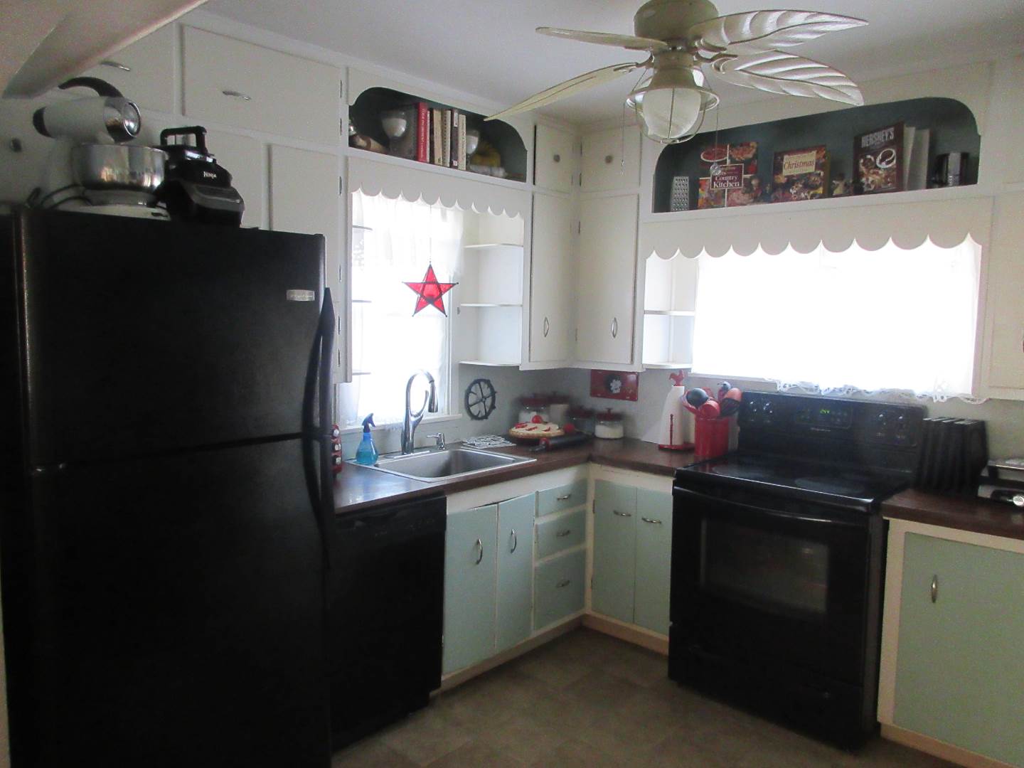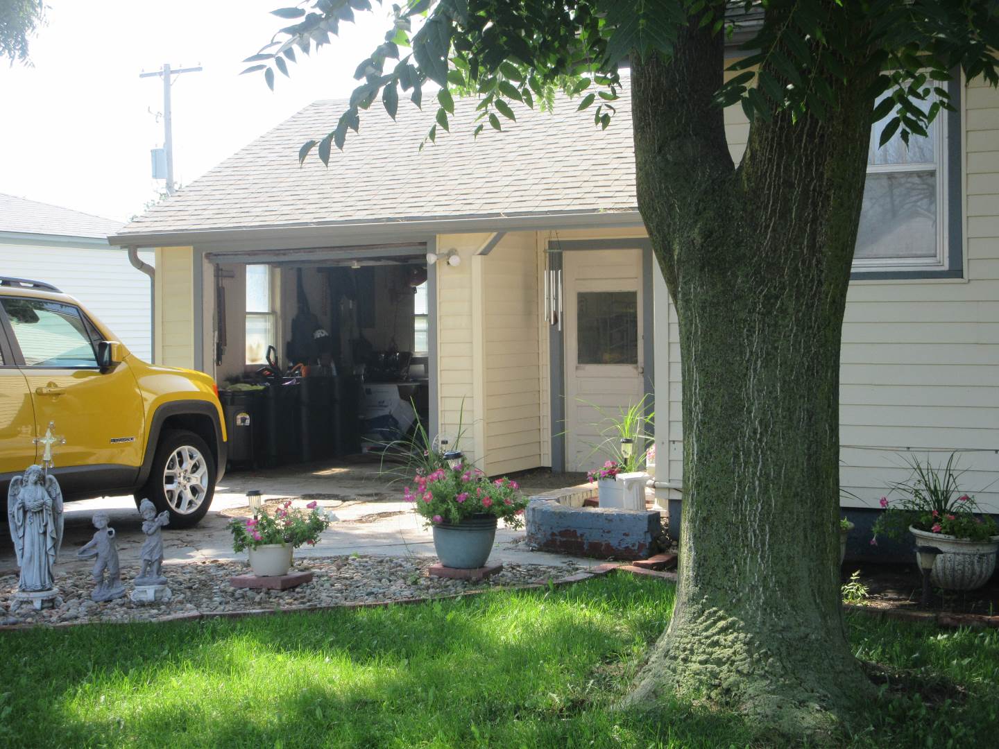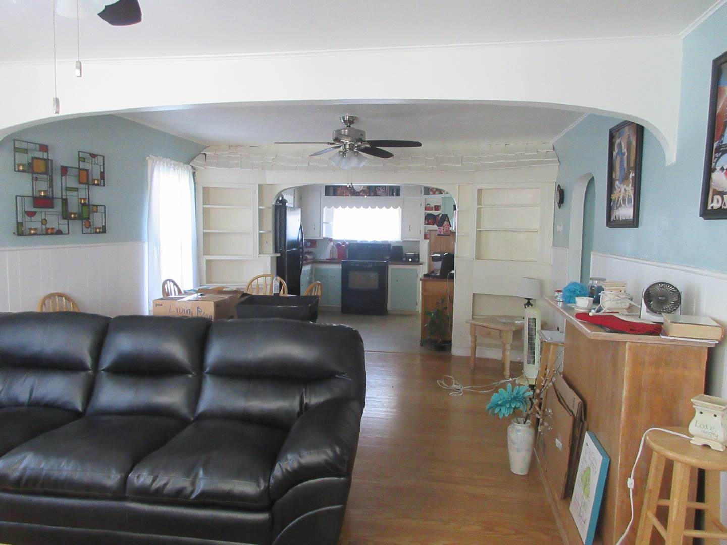 513 N. Jones, Norton, Ks. 2 bedrooms and 2 bathrooms bungalow with finished basement and 1 car attached garage. Large open front porch with mature landscaping on a corner lot. Open concept living space with living, dining and kitchen. Kitchen and dining area with built in shelves and bookcases to create that bungalow feel. Refrigerator & range stay with home. 2 bedrooms upstairs with built in closets and shelves. Full bathroom between the bedrooms with a soaker tub-shower combination. Linen closet in hallway. The basement has 4 large spaces that one could be a non-conforming bedroom. There is a bathroom with a shower and linen closet. Built in bookcases in 2 of the other rooms. One room is currently set up to be a media room. A laundry room at the base of the stairs is roomy and has a large utility closet. The garage is attached to house with an exterior door that opens into a shop/storage area with a 1 car space. There is also, another exterior door to the shop part from the South side of the home.